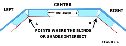 - Where the Center section of the window meets the Left section: From the Center window Section, Measure out the distance of the depth for the blind type you are using. At this point make a small mark on your ceiling demonstrated by the red line on figure 1.